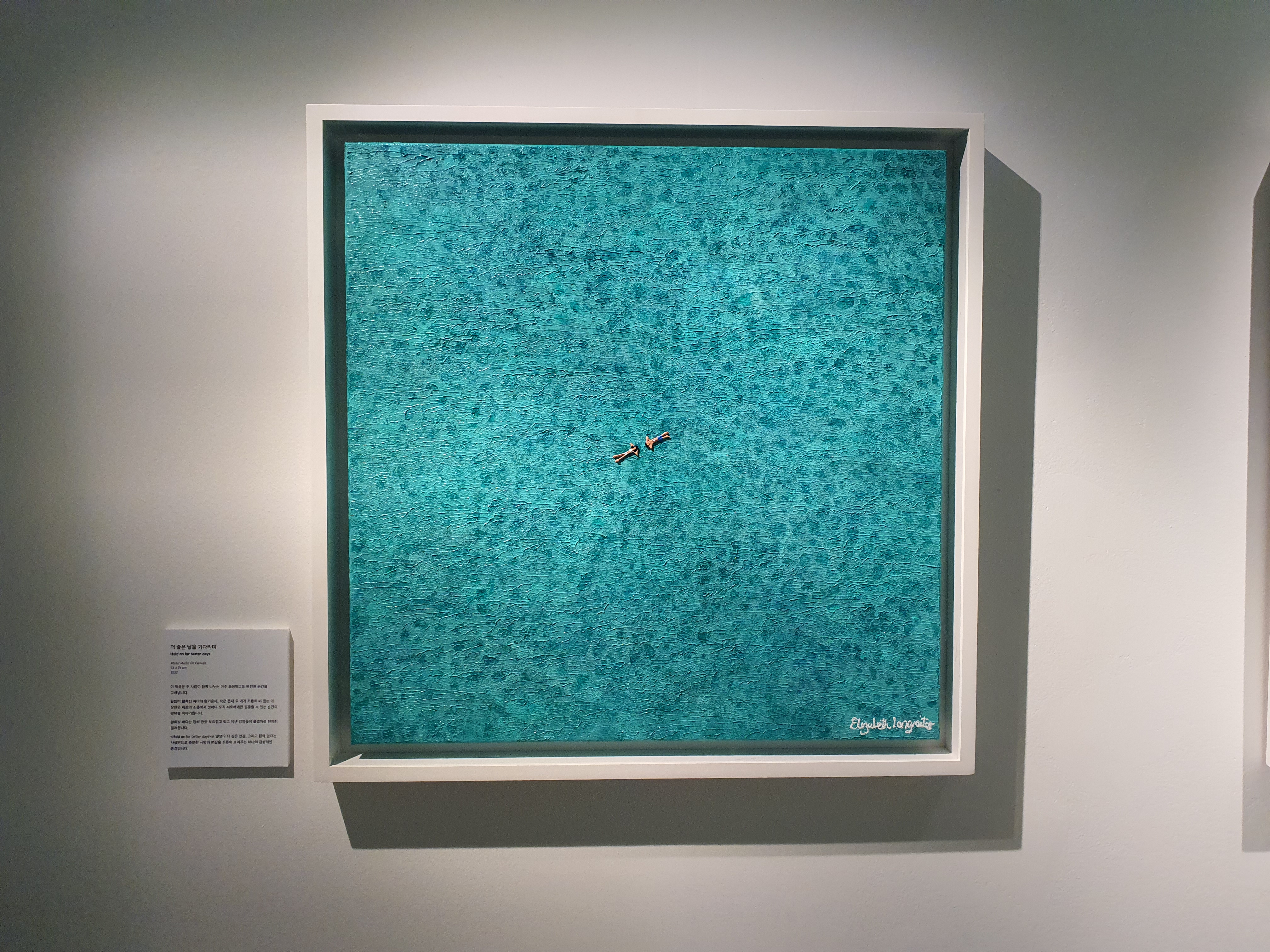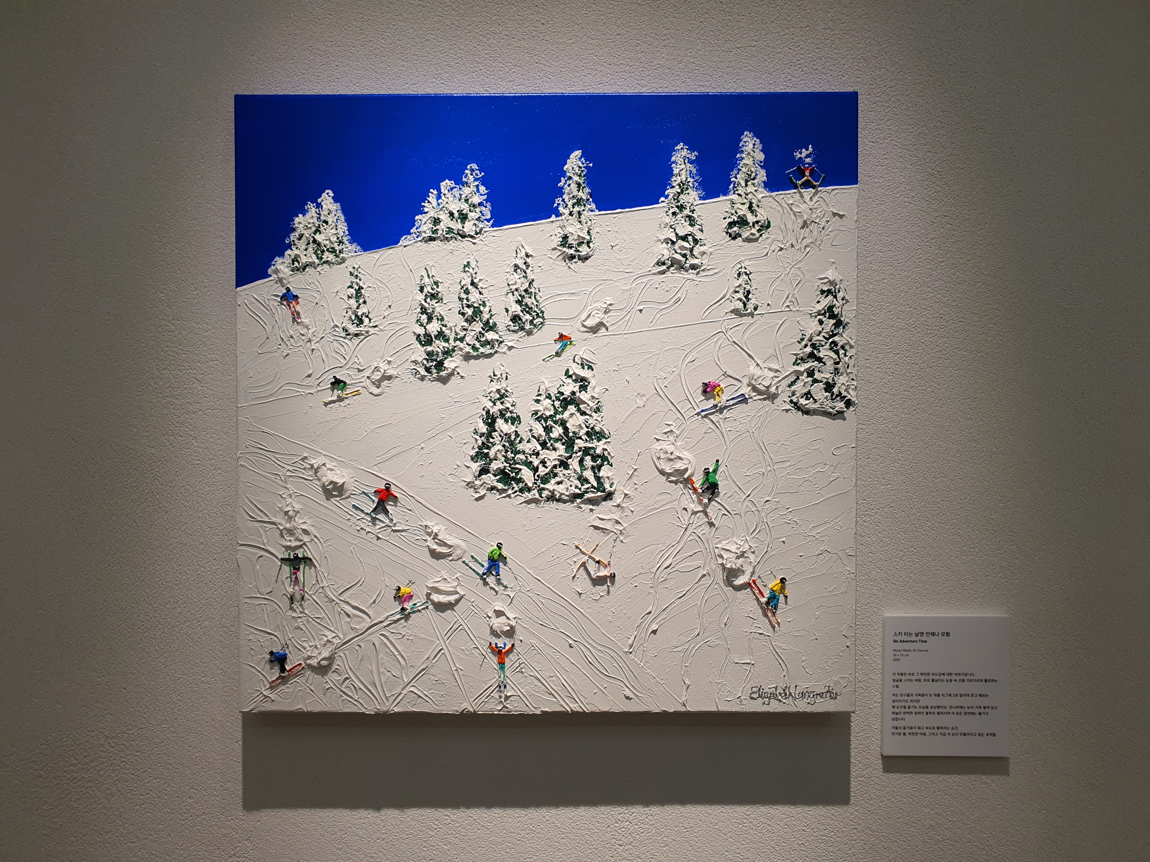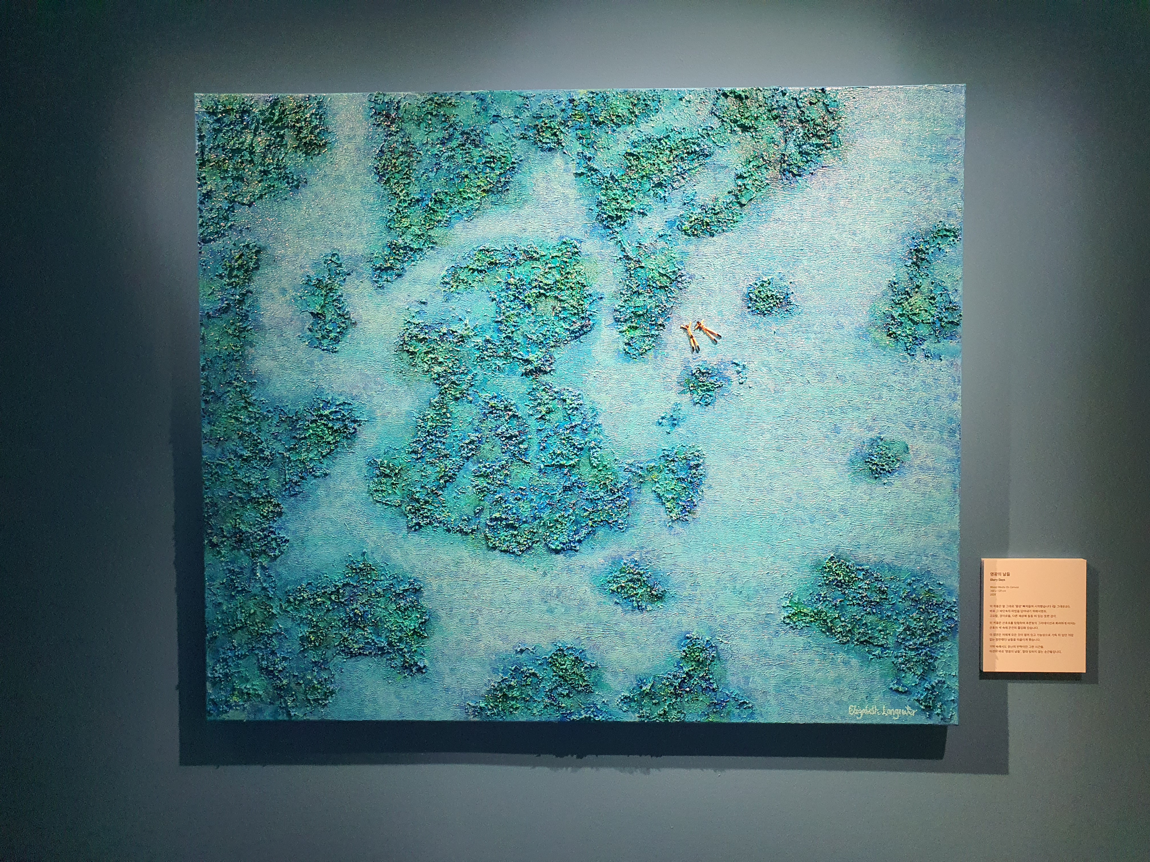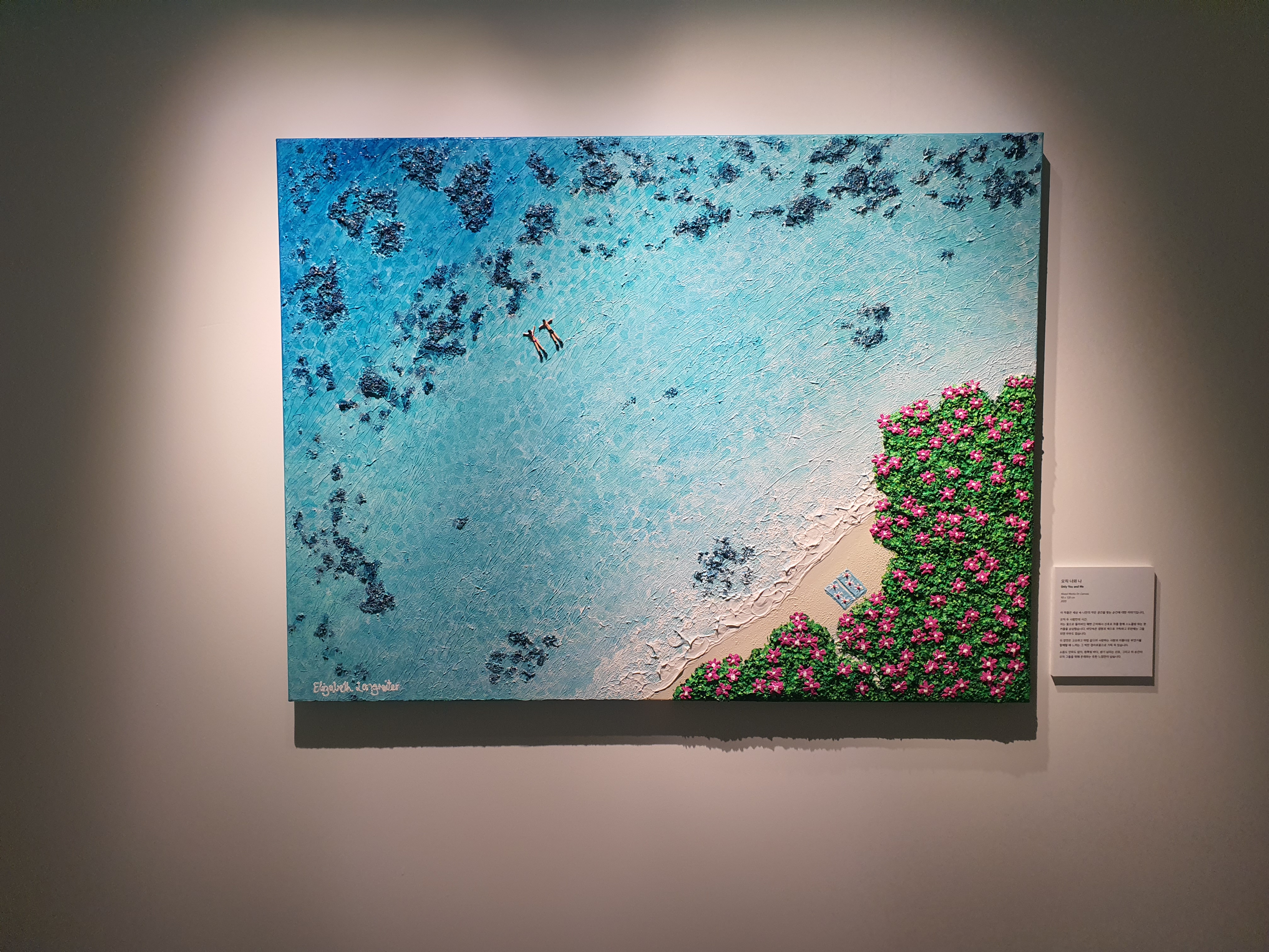 들어가자마자 시원한 바다들이 맞이해 준다. 전시는 여름, 겨울, 봄의 계절을 담고 있지만 그 중에서도 작가는 바다를 낙원으로 바라보고 있는 듯 하다. 바다, 두 사람, 연인, 평온, 고요. 자연 속에서 인간은 굉장히 작은 요소로 묘사된다. 돌, 파도, 물, 깊이, 꽃, 야자수, 파라솔, 매트. 작은 사람들을 둘러 싸고 있는 수많은 오브젝트들이 눈에 들어온다. 가상 특이했던 것은 물감을 겹겹이 쌓아서 입체감 있게 표현한 것이다. 실제로 사람과, 파도와, 돌멩이, 꽃들이 튀어나올 것처럼 느껴진다. (실제로 튀어 나와 있다.)