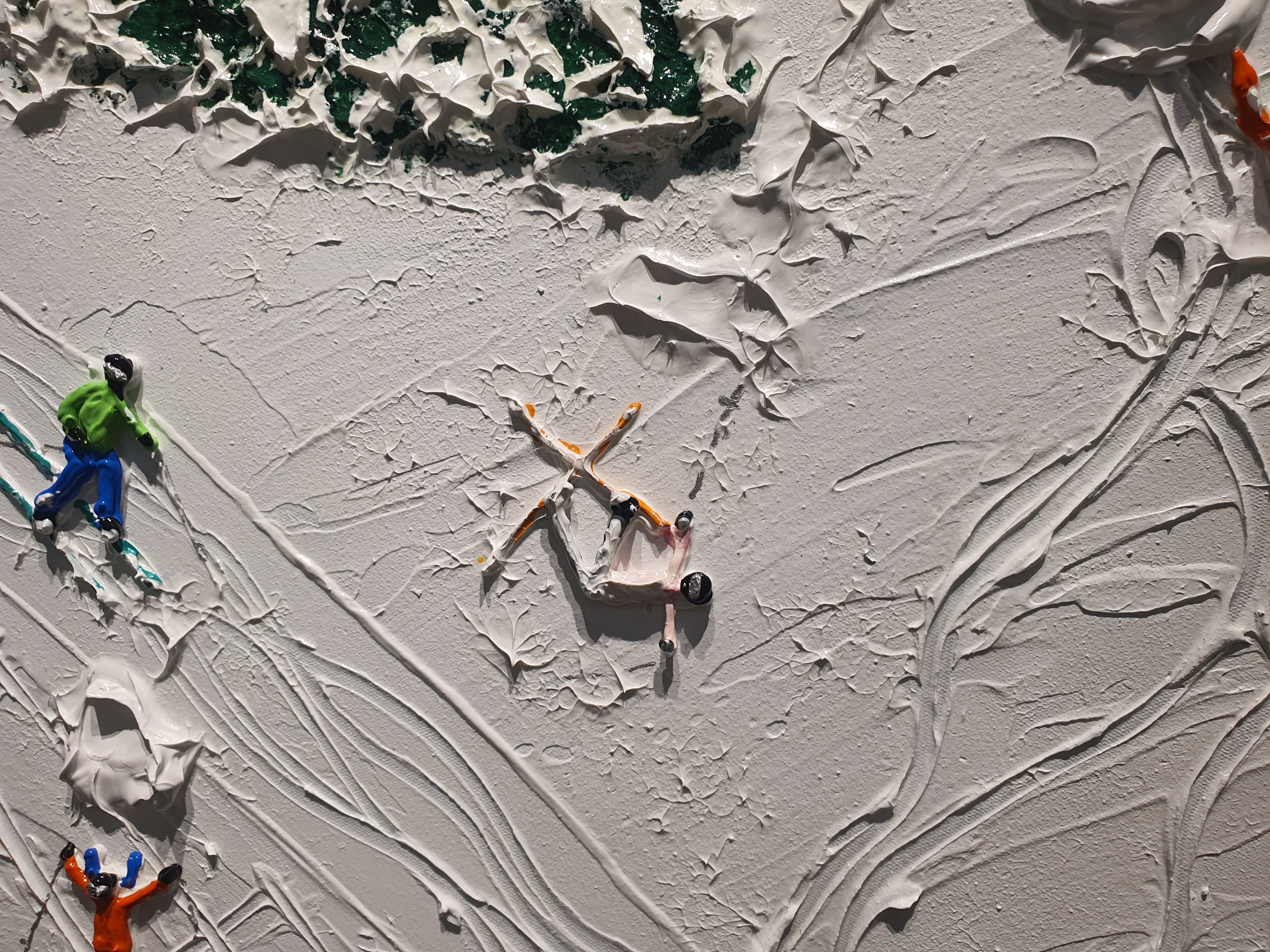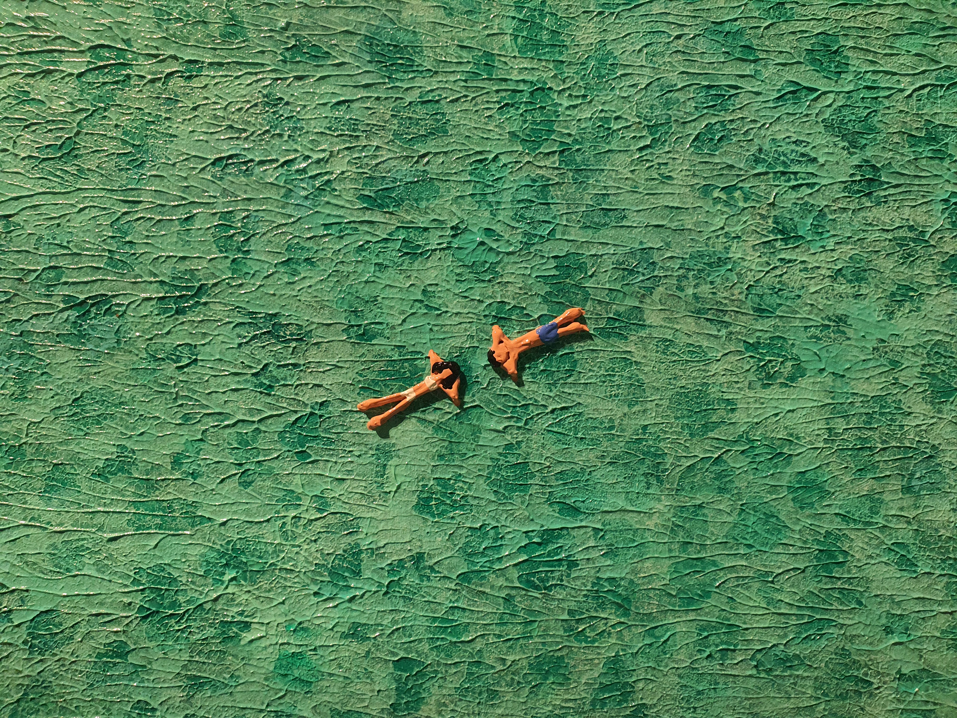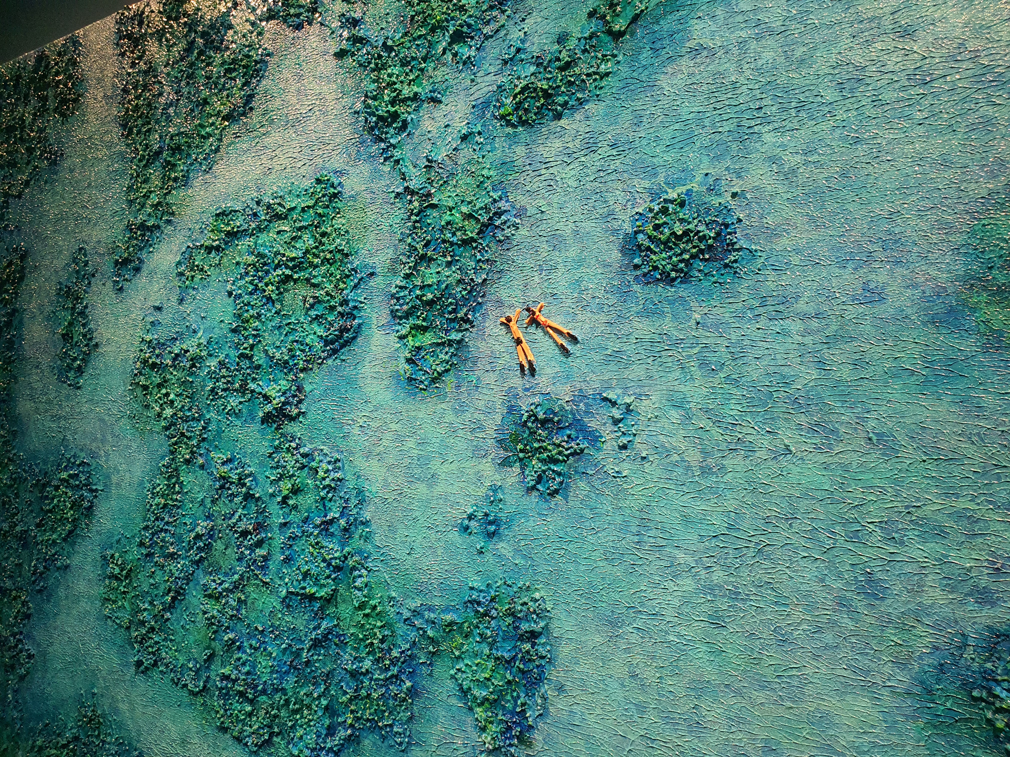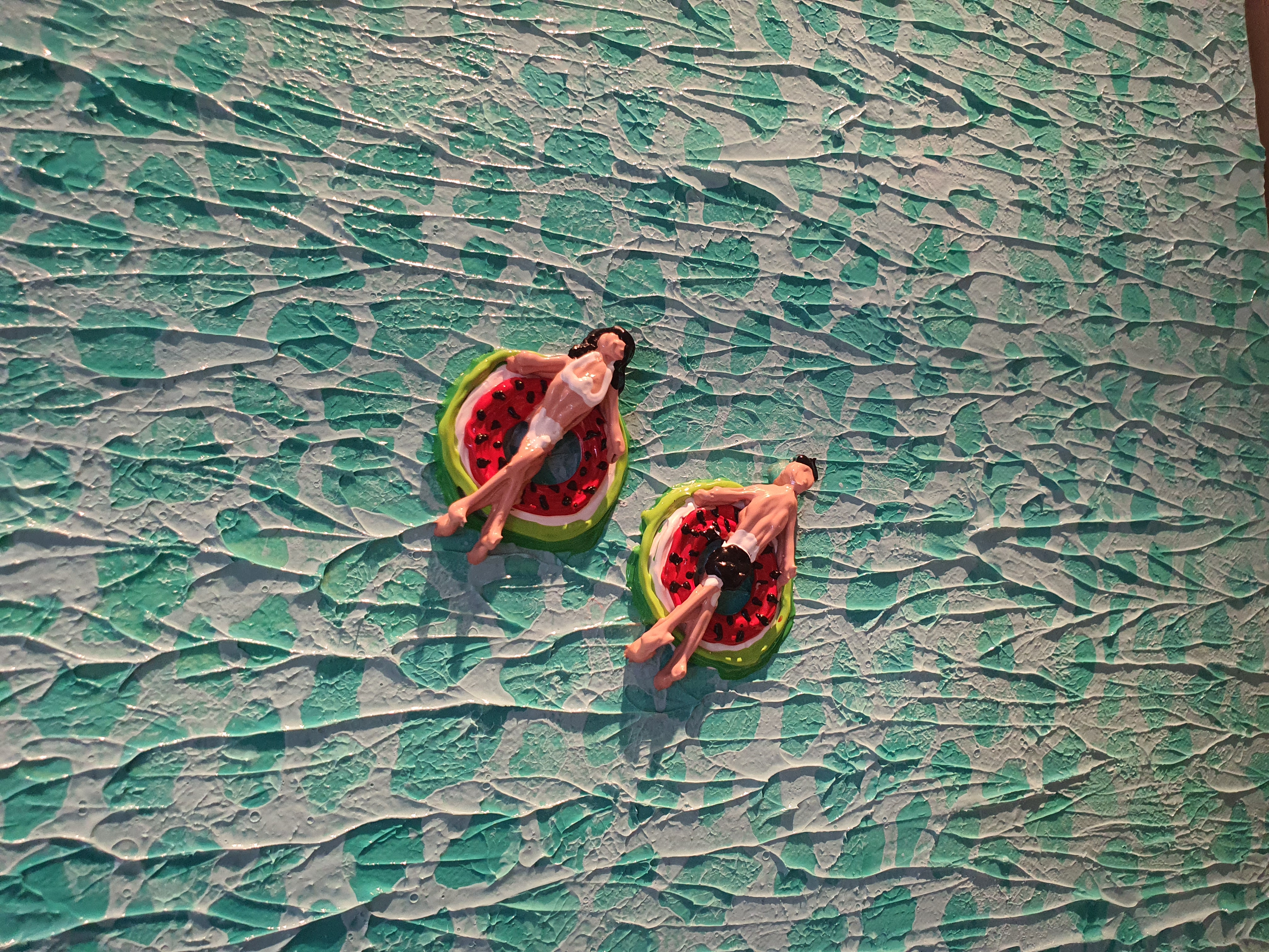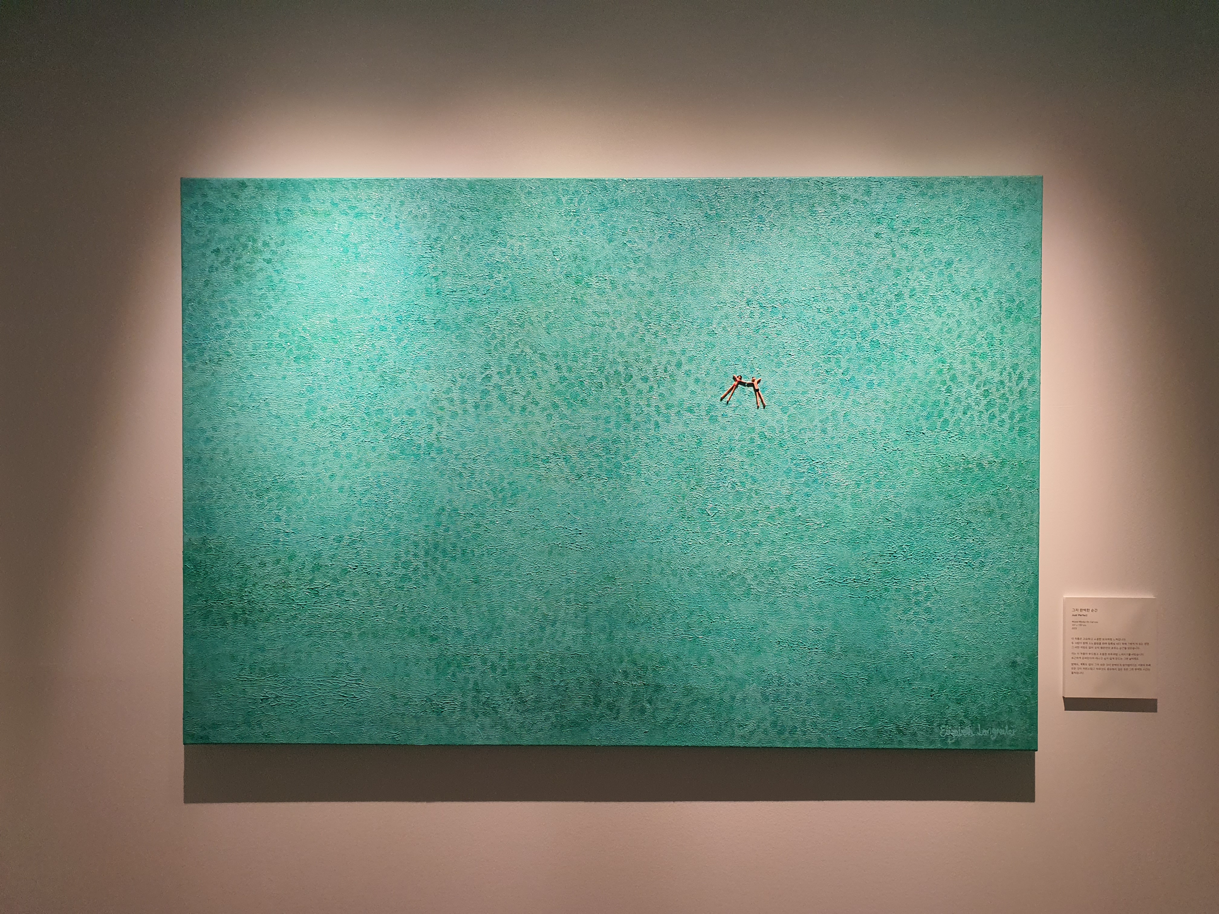 들어가자마자 시원한 바다들이 맞이해 준다. 전시는 여름, 겨울, 봄의 계절을 담고 있지만 그 중에서도 작가는 바다를 낙원으로 바라보고 있는 듯 하다. 바다, 두 사람, 연인, 평온, 고요. 자연 속에서 인간은 굉장히 작은 요소로 묘사된다. 돌, 파도, 물, 깊이, 꽃, 야자수, 파라솔, 매트. 작은 사람들을 둘러 싸고 있는 수많은 오브젝트들이 눈에 들어온다. 가상 특이했던 것은 물감을 겹겹이 쌓아서 입체감 있게 표현한 것이다. 실제로 사람과, 파도와, 돌멩이, 꽃들이 튀어나올 것처럼 느껴진다. (실제로 튀어 나와 있다.)