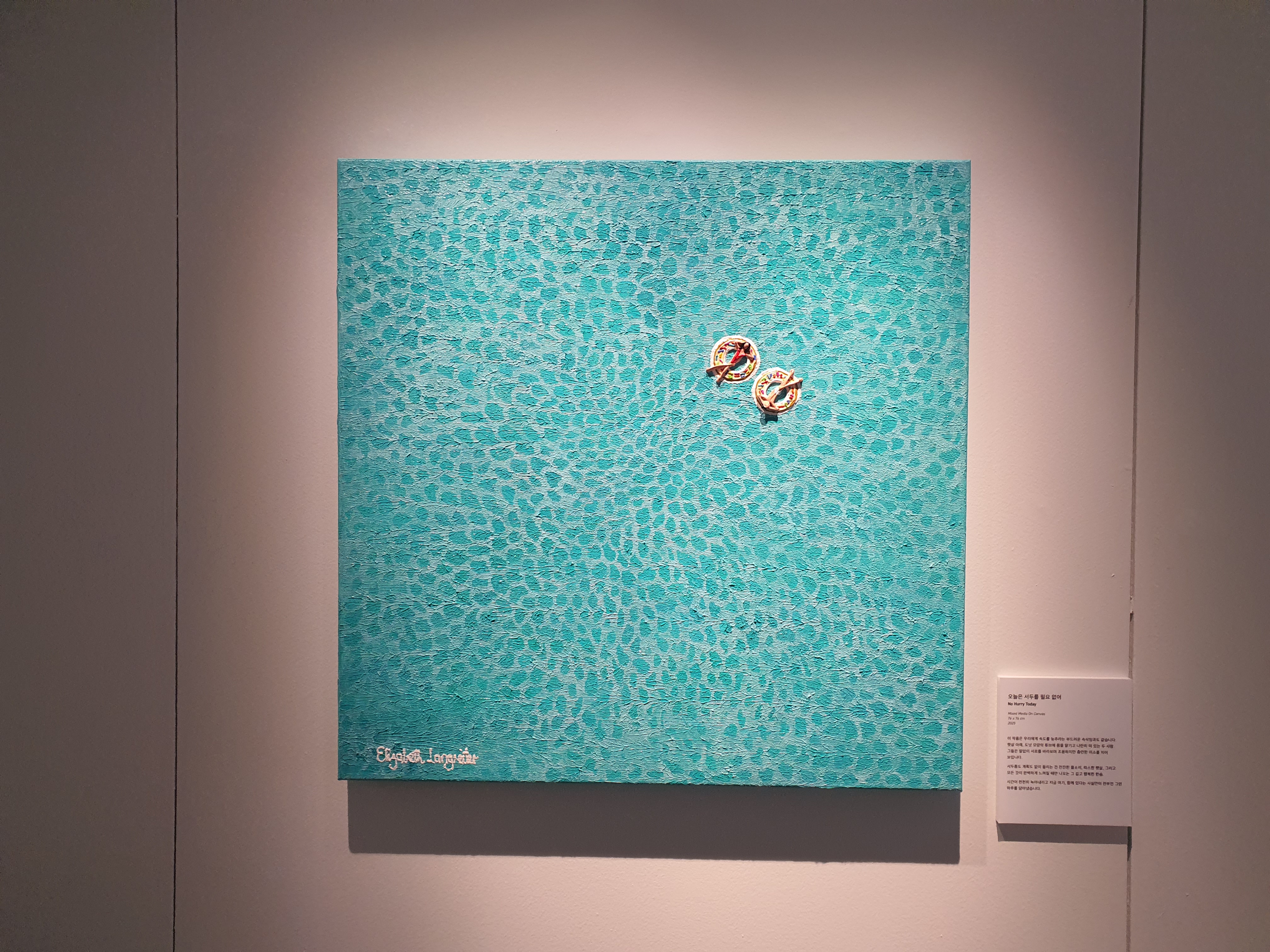 엘리자베스 랭그리터 전시회가 끌렸던 것은 '매일이 휴가'라는 주제에서 평범한 일상에서의 만족감을 얻을 수 있을 것 같다는 기대감이 있었기 때문이다. 최근 감각을 쌓기 위하여 다양한 경험을 해보려고 노력을 하고 있고, 실제로 새로운 환경을 많이 접하기는 하지만 매번 새로운 경험을 하기란 여간 쉬운 일은 아니다. 그리고 '새로움' 자체에 강박을 느끼고 싶지도 않다. 중요한 것은 결국 현재의 시간을 즐기는 것이기에 종종 색다른 경험을 하면서 풍부한 물감을 뿌려볼 수는 있겠지만, 그 기반이 되는 캔버스에서도 나만의 평범하지만 만족스러운 리듬을 유지하고 싶다. 세상에 존재하는 많은 것들에서 배울 것은 항상 있을 것이다. 하지만 더 키우고 싶은 것은 외부 환경에 연연하지 않고 즐기는 사람이 되자는 것. 그런 태도를 갖추는 것.