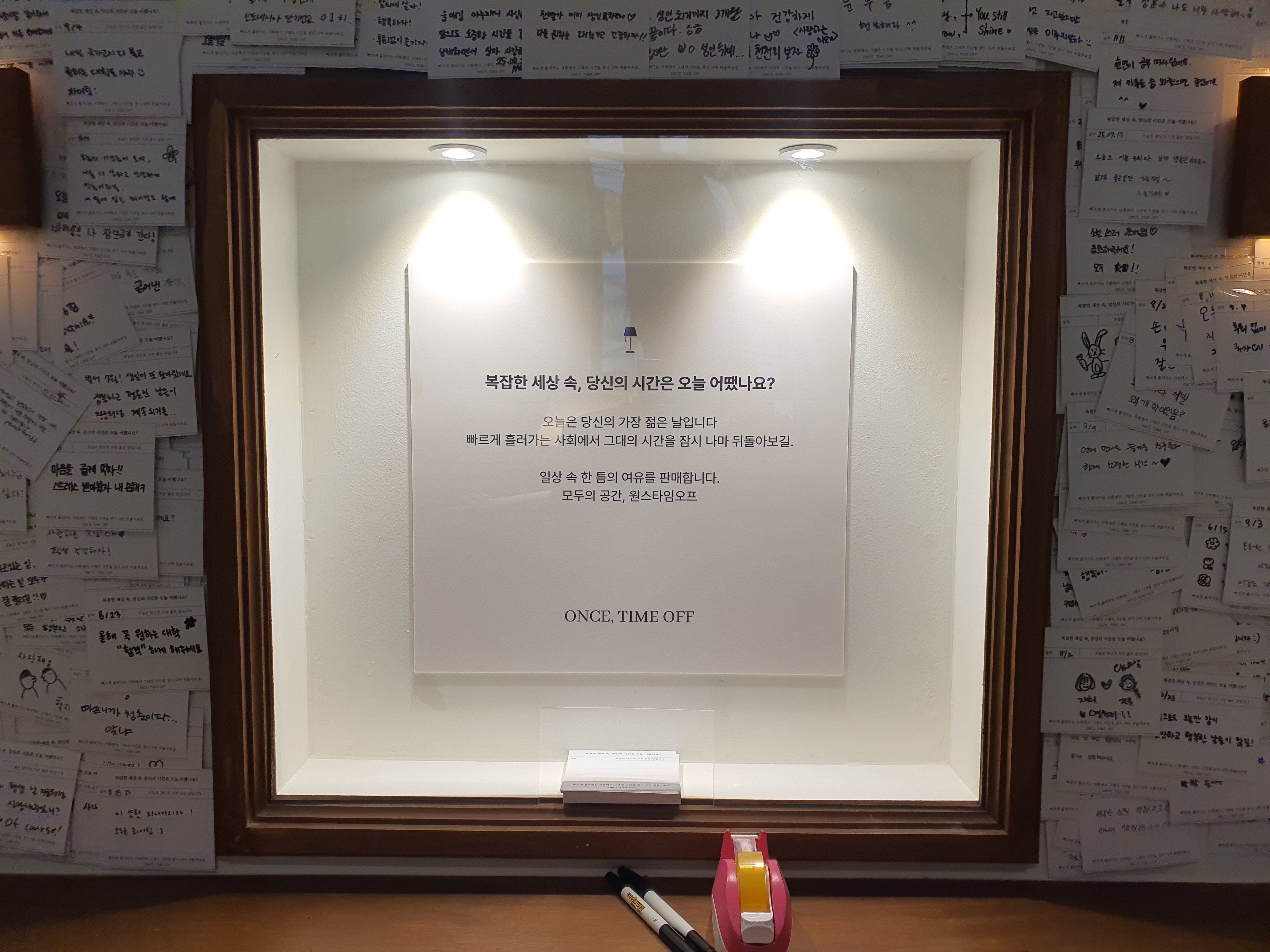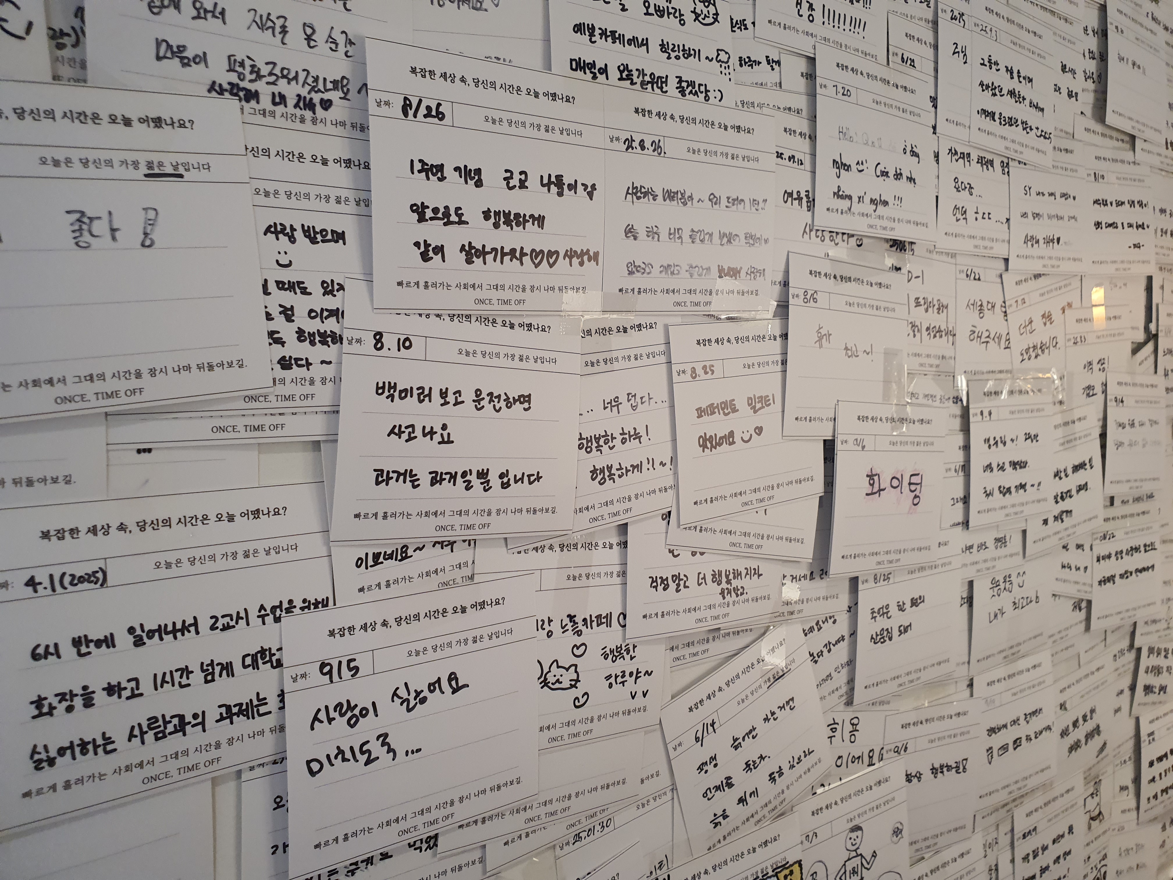 오늘 간 카페 한 구석에는 복잡한 세상 속에서 나의 오늘이라는 시간을 묻는 공간이 있다. 많은 이들의 오늘이 벽에 붙어 있다. 다 읽지는 않았는데, 무엇하나 같은 시간이 없다. 사람을 싫어하는 누군가, 사람을 사랑하는 누군가. 물론 이들의 수많은 오늘의 시간도 분명 다를 것이다. 나의 오늘은 따뜻하고 시원하고 다채로움이다. 인연이 닿은 존재들에게 감사하는 날이다.