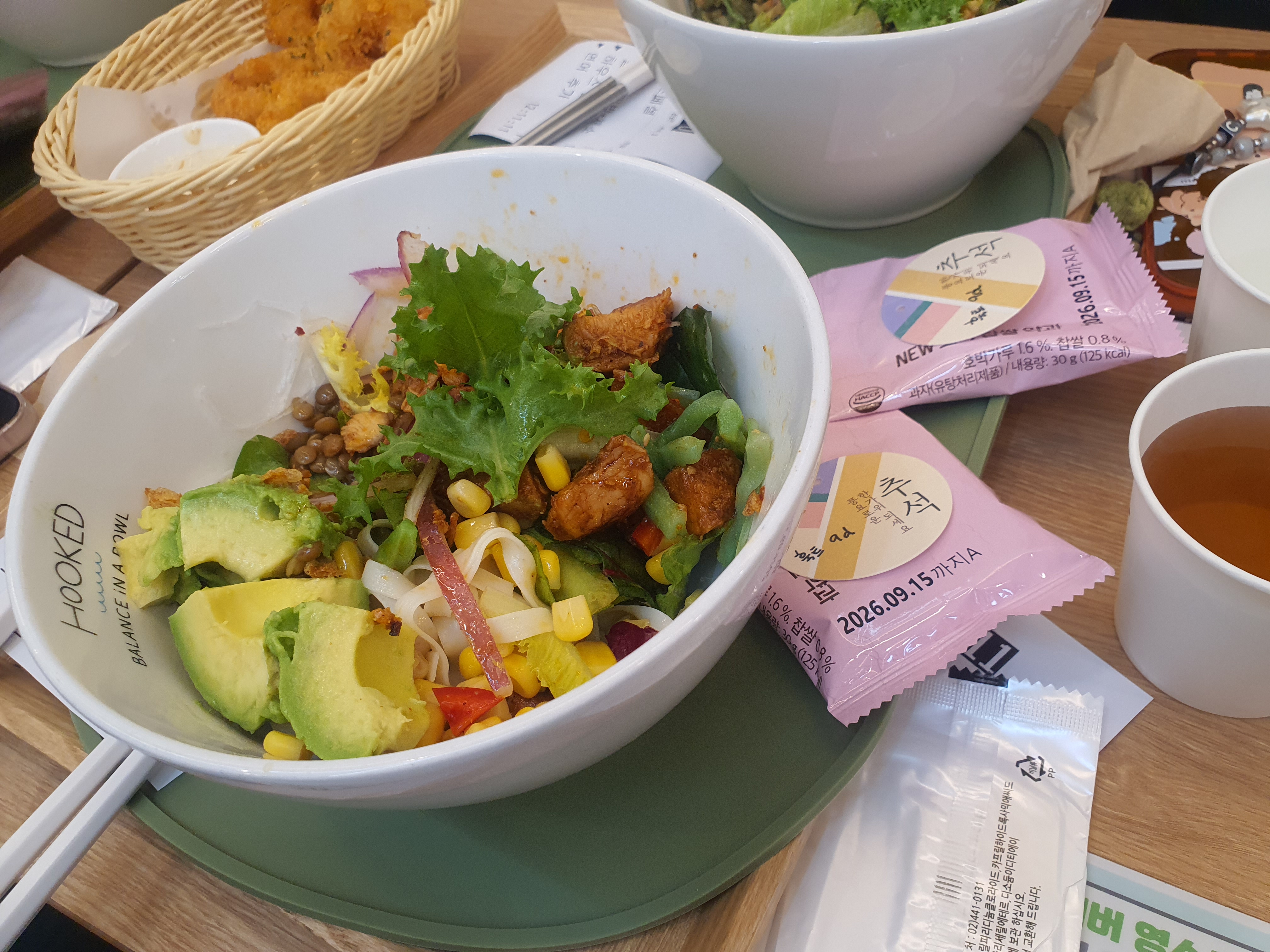 어제에 이어 포케를 먹었다. 육회 샐러드가 맛있었지만 새로운 도전을 하기 위하여 닭 가슴살 샐러드를 시켰다. 이번에도 두유면과 채소 반반. 아보카도도 추가했다. 몸에 좋은 지방. 먹는 도중에 일하시는 분이 추석 선물이라고 약과를 나누어주셨다. 생각지도 못한 선물을 받게 되어서 서로 감사 인사를 나누면서 기분이 좋아졌다.