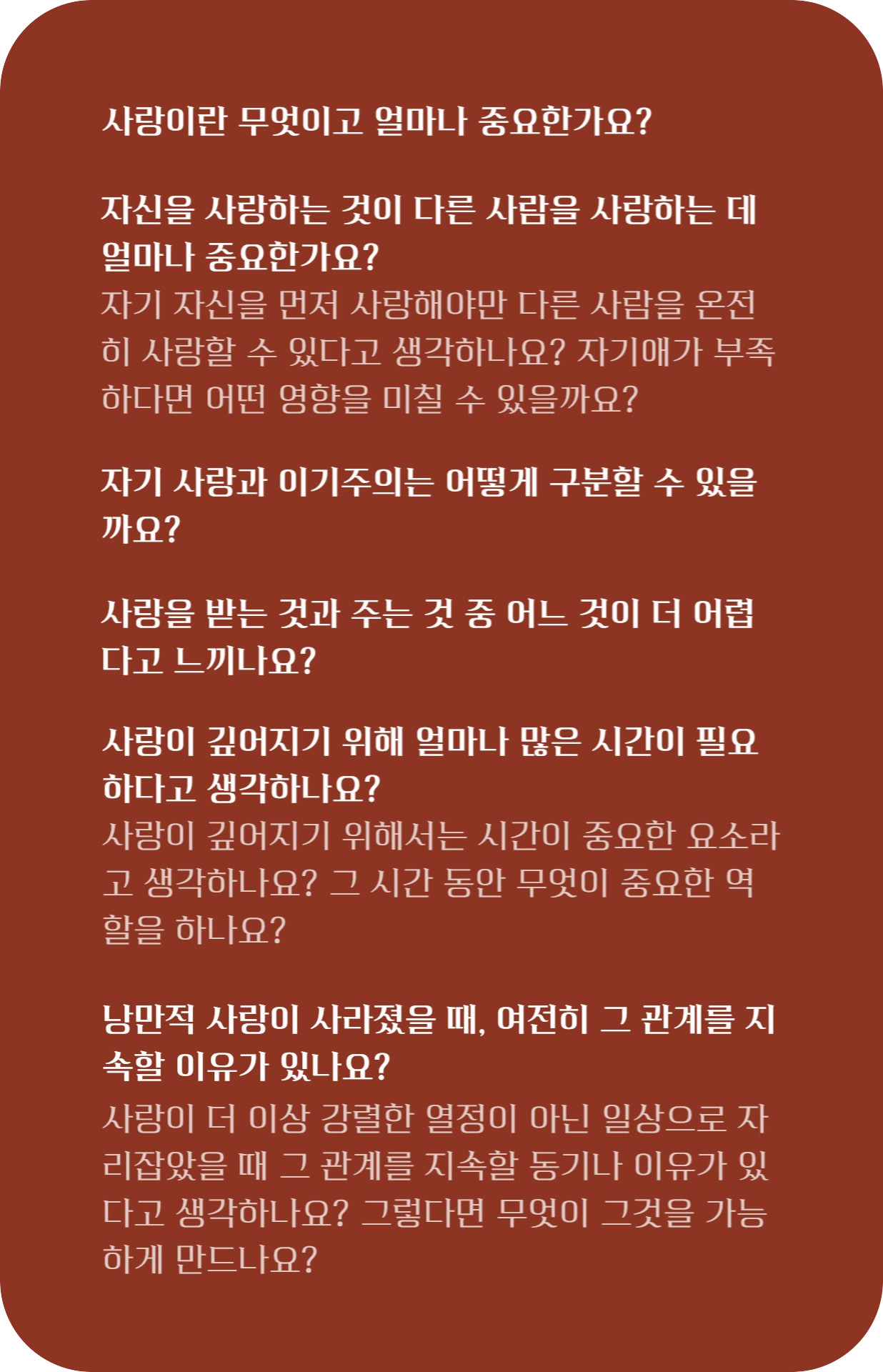사랑은 역시나 정의하기 어려운 단어였다. 답이 없는 것은 알고 있지만 그래도 어떻게 표현해야 그 생각과 감정이 잘 전달될지 고민했지만 여전히 아쉬움은 있는 것 같다. 어떤 분은 과거의 경험으로 대신했다. 군대에 있을 때 여자친구를 보기 위하여 먼 길을 운전하고, 잠을 줄여서까지 오가며 헌신한 것. 내가 표현한 사랑은 어떤 존재를 있는 그대로 바라볼 수 있고 특별한 기대를 하지 않는 것. 모두가 공감한 것은 답을 내리기 어려우며 시기에 따라 그 표현이 달라질 것이라는 것. 그렇게 오늘 이 시간에 할 수 있는 설명을 조금씩 고민해보면서 이야기를 나누었다.
