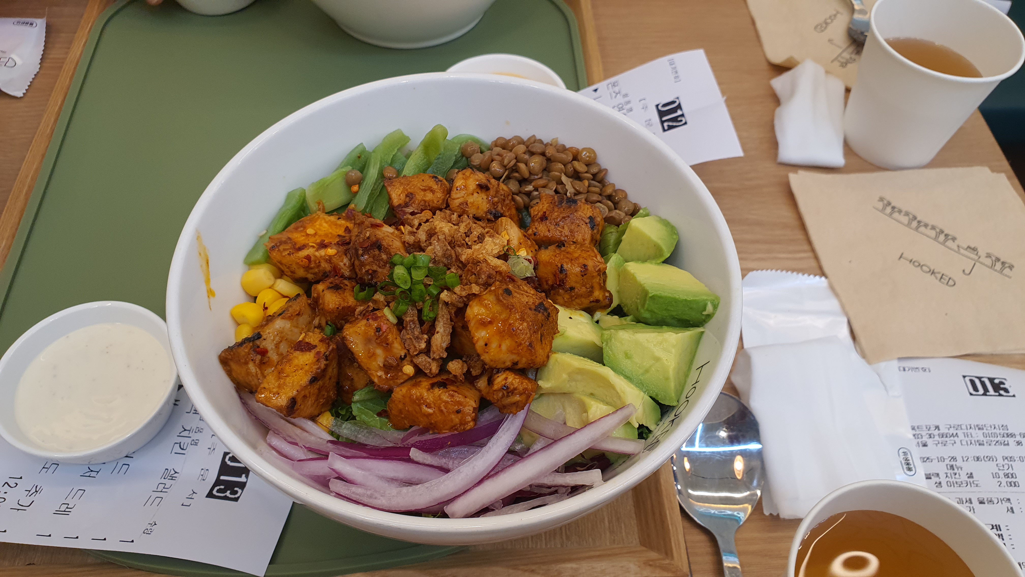 오늘의 점심. 닭가슴살 포케. 샐러드 100%로 주문했다. 굳이 두유면을 먹을 필요가 없었는데, 기존에는 왜 두유면을 50%로 선택했는지 나도 나를 모를 일이다. 포인트가 얼마 남지 않았지만 아보카도를 추가했다. 미래의 내가 굶으면 되기 때문에 오늘의 나는 먹고 싶을 것을 먹기로 했다. 그렇게 추가한 아보카도는 아주 고소하고 맛있었다. 정말 싱싱한 아보카도였다.