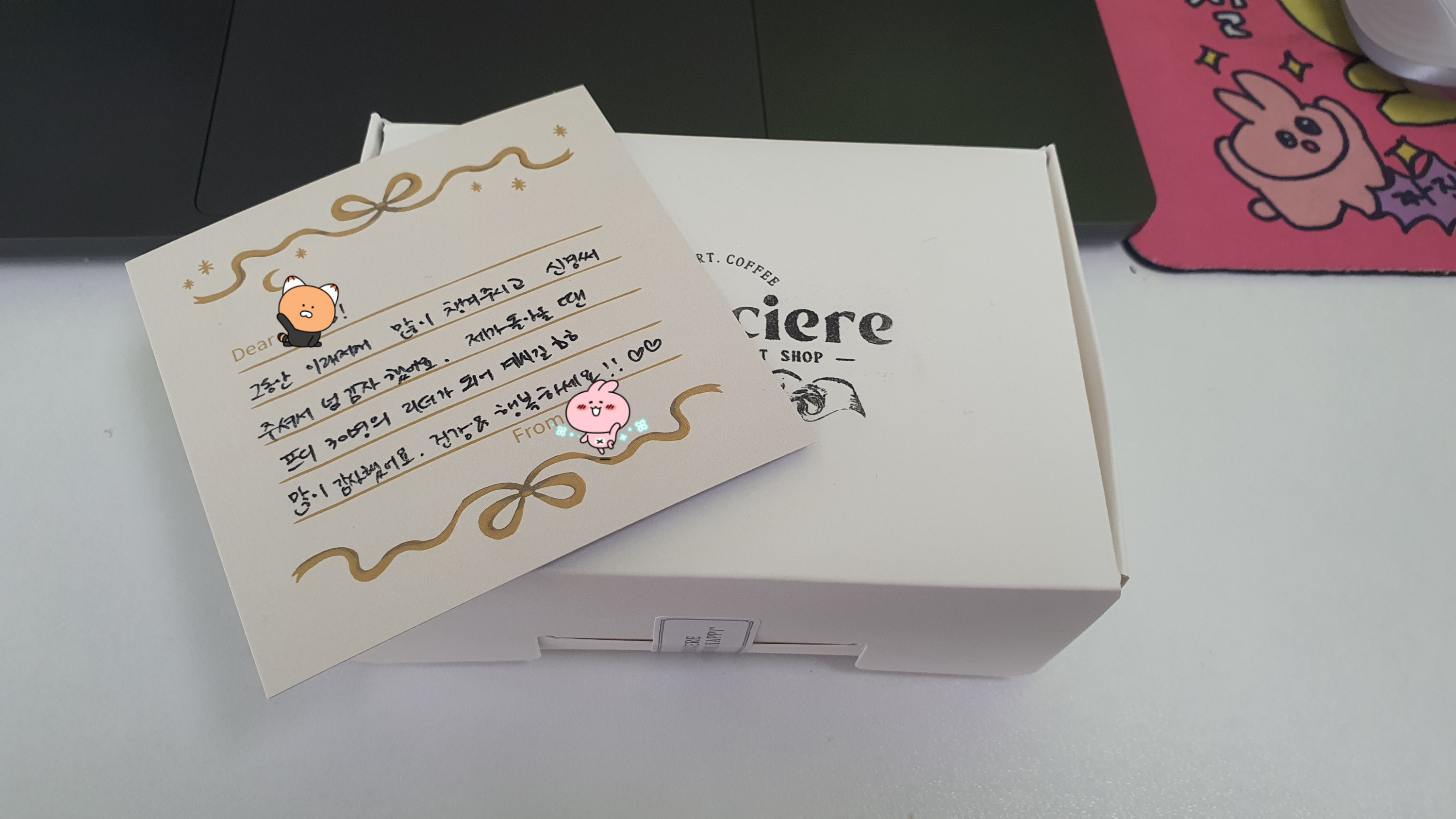 선물도 받았다. 단단하게 포장되어 있는 박스를 풀어보니 휘낭시에다. 베이커리에 취미를 가진 동료라서 직접 만든 건가 싶었는데 브랜드 제품인 것 같다. 최근 휘낭시에를 좋아하게 되었자. 이것도 인연! 소소하게 대화도 나누고 미래도 공유하는 시간을 가짐에 감사하는 날이다. 얼마 전에 27년에 자립 계획을 세우기는 했지만 사실 어떻게 될지는 잘 모르겠다. 그래도 멈춰있고 싶지는 않으니 뭐라도 꾸준히 할 것 같다.